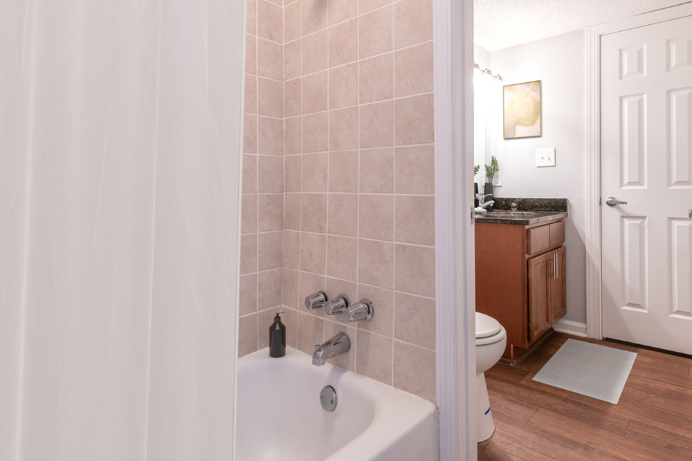 A bright and cheerful family room with luxury vinyl flooring and dramatic architecture leads, through sliding glass doors, to a private patio entrance. A fully equipped kitchen has a breakfast bar, LED lighting, black appliances, easy-to-clean ceramic backsplash tiling, and luxury vinyl flooring. Fully upgraded units contain stainless steel appliances, low-hanging bar lights, and timeless granite countertops.